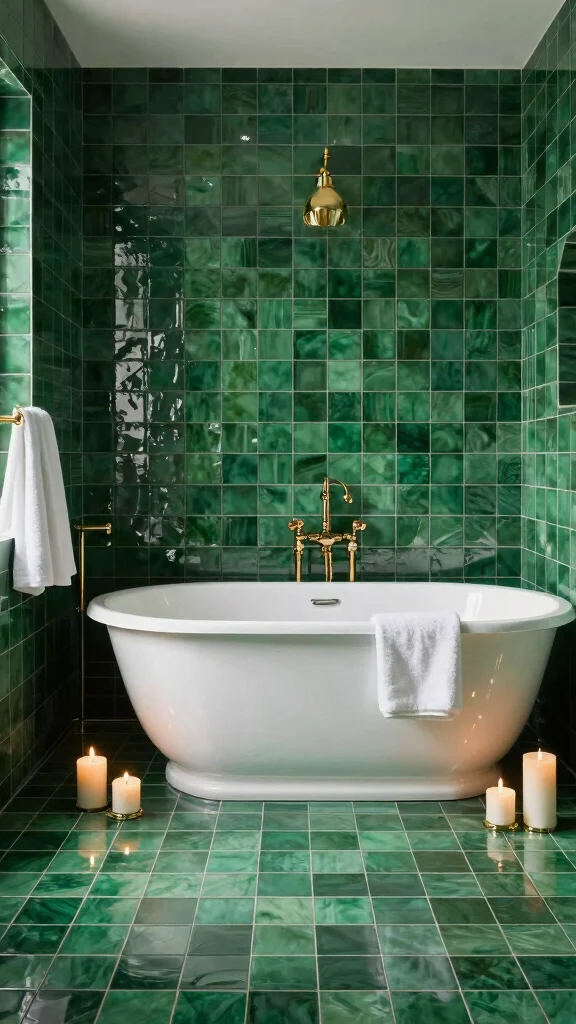 Bold forest green tiles can transform your bathroom into a stunning sanctuary. This rich, deep hue evokes nature’s beauty, creating a luxurious backdrop for your fixtures and decor. Pairing these tiles with warm wood accents offers a beautiful contrast, making the space feel both inviting and sophisticated. For example, consider using these tiles as a feature wall behind your vanity or around your bathtub to create a dramatic effect.