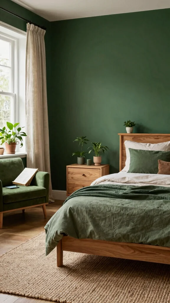 A green accent wall is a simple yet powerful way to connect with nature in your bedroom.