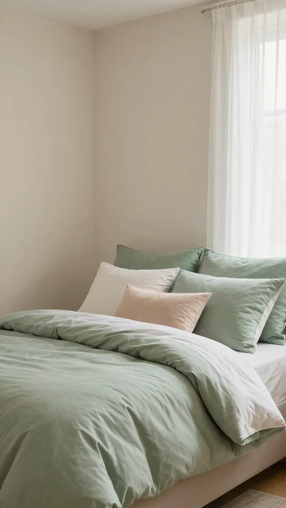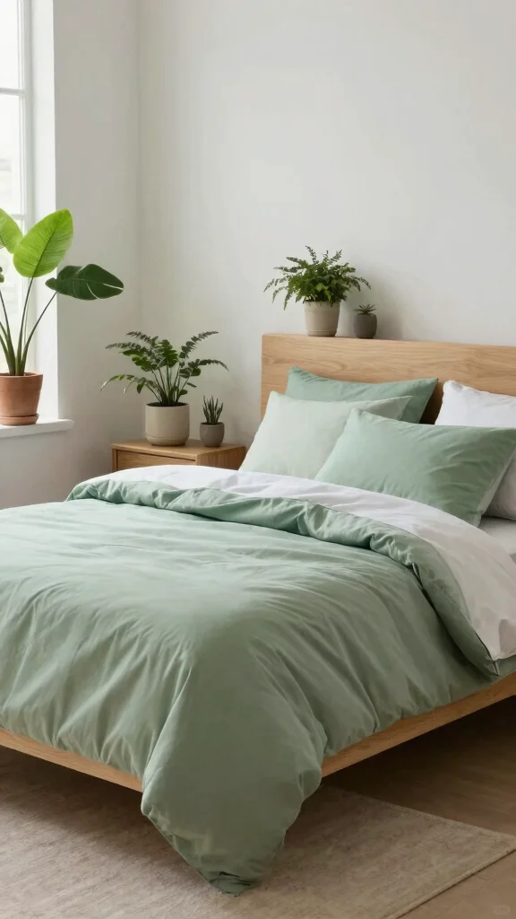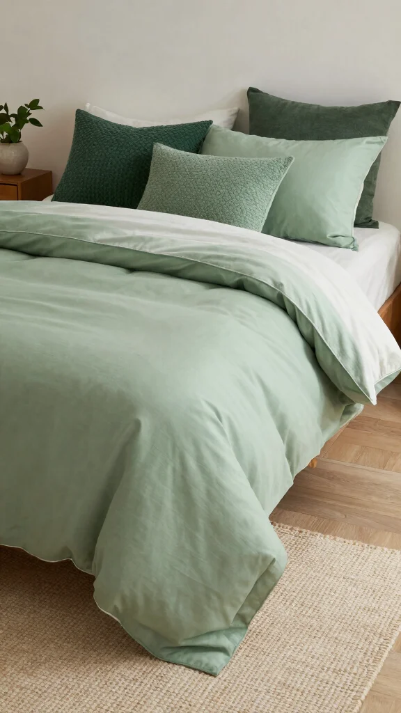 Bedding is an effective way to introduce calming greens to your bedroom. Select soft green bedding crafted from organic materials to create a peaceful atmosphere while promoting sustainability. Light shades like mint and seafoam contribute to an airy feel, perfect for a restful night’s sleep. Elevate your look by pairing plain sheets with textured quilts and decorative pillows for added charm.