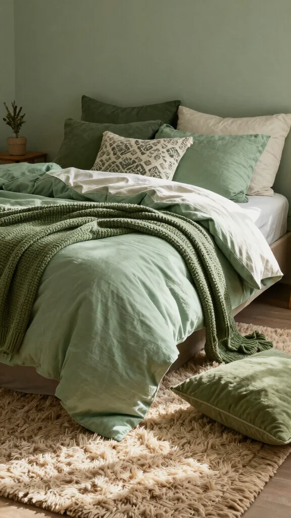 Creating a visually engaging green bedroom is all about layering textures. Combine materials like linen, velvet, and cotton in varying shades of green to add warmth and depth. This not only makes your space more inviting but also enriches the tactile experience, enhancing comfort. Start with a light green duvet, then add textured throw blankets and cushions in darker hues for a cozy feel.
