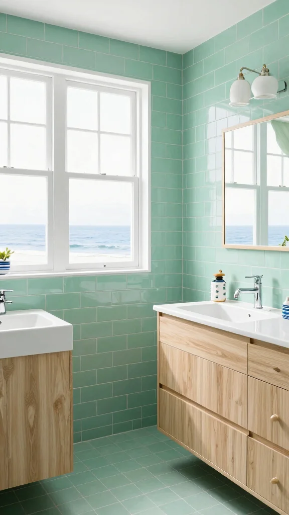 Natural light is essential in a coastal bathroom; consider large windows or skylights to flood the space with brightness. This setup not only enlarges the area but also highlights the green tiles’ beauty.