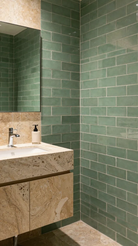 Combining green subway tiles with natural stone can create a stunningly sophisticated bathroom. Using green tiles as an accent against stone walls adds a contemporary touch to rustic elements. Pairing with warm-toned stones like travertine or slate softens the look while enhancing natural aesthetics.