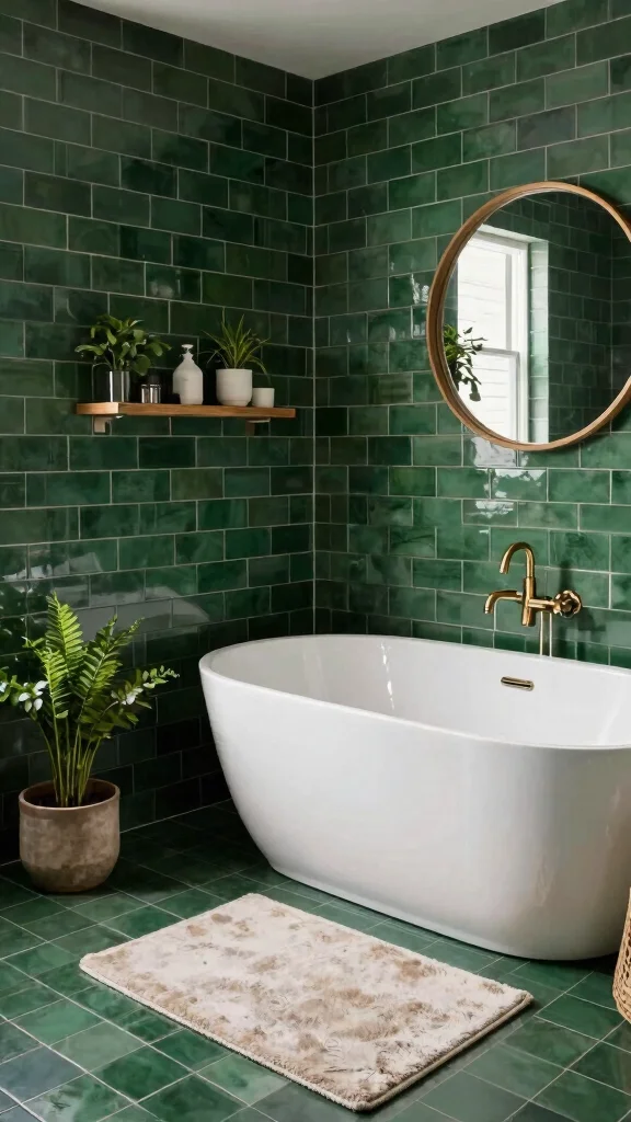 Glossy emerald subway tiles can instantly enhance the sophistication of your bathroom, offering a modern and chic vibe. Their reflective surface brightens the space and creates an inviting atmosphere. Pair these tiles with sleek fixtures in matte black or polished chrome to maintain a contemporary feel. A minimalist decor strategy allows the glossy tiles to shine as the main attraction.