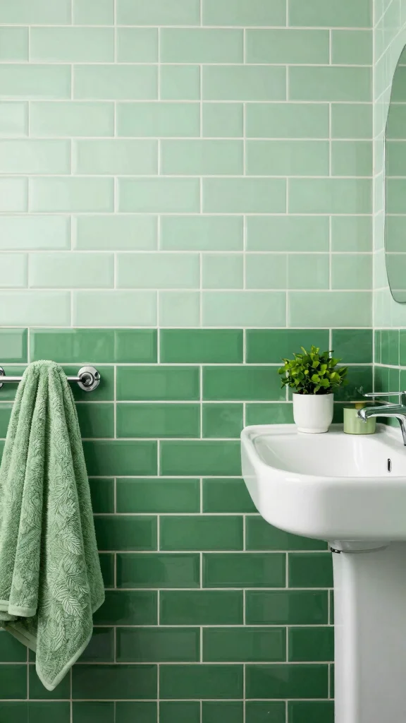 To emphasize the design further, consider a contrasting grout color that highlights the tile arrangement. Keeping accessories in line with the two shades of green ensures a cohesive appearance.
