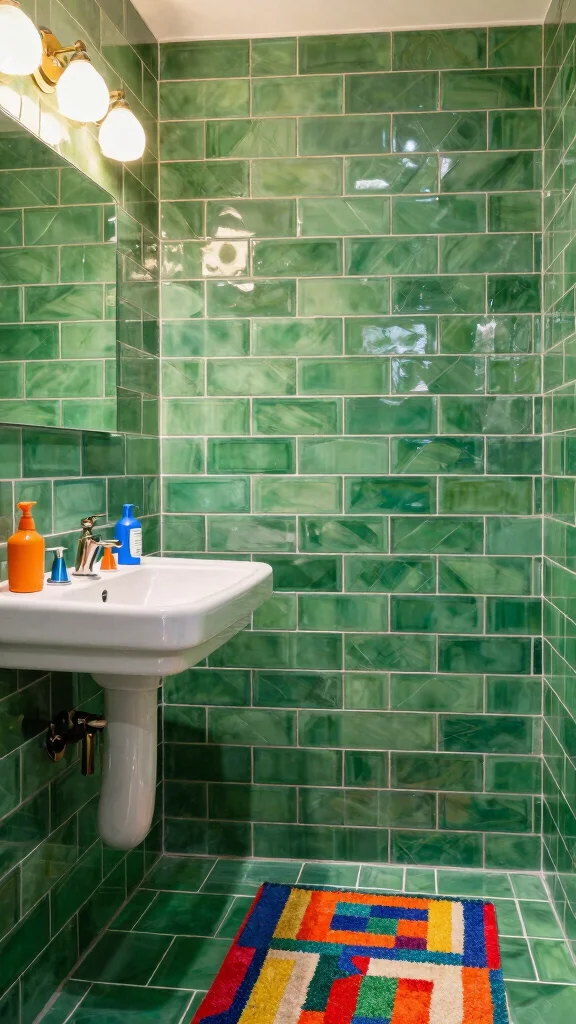 Utilizing various green shades in the tiles creates a fun, cohesive palette that keeps the space lively. Incorporating quirky accents like bold-colored towels or unique lighting fixtures can enhance the playful vibe.