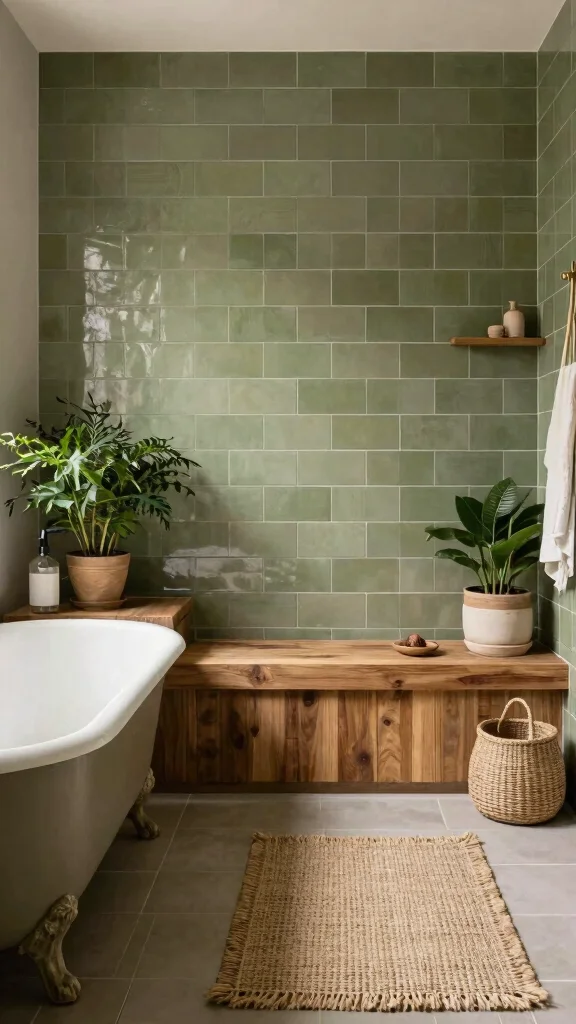 Olive green subway tiles bring an earthy vibe to your green subway tile bathroom—pair them with natural wood, stone, and plants. Add a barn door or wood beams for rustic charm, then lean into vintage accessories for a timeless, eco-friendly look.