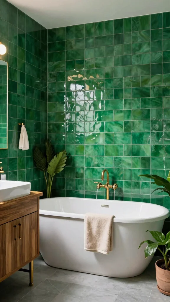 Vibrant emerald green tiles can dramatically elevate your bathroom, transforming it into a luxurious space. This bold color brings a sense of richness and warmth, especially when paired with crisp white fixtures. The contrast creates a stunning visual that captures attention and adds depth, making emerald tiles perfect for accent walls or striking flooring designs.