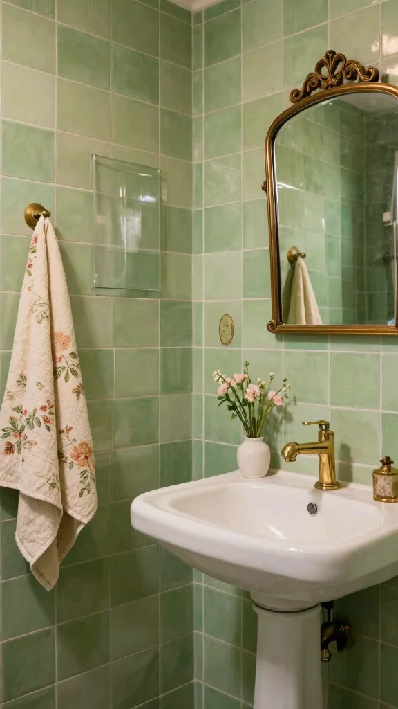 Pair vintage green tiles with ornate mirrors and antique cabinetry for a cohesive design. You can also incorporate vintage-style light fixtures that complement the overall aesthetic. Adding soft textiles, like floral towels, enhances the vintage vibe even further.