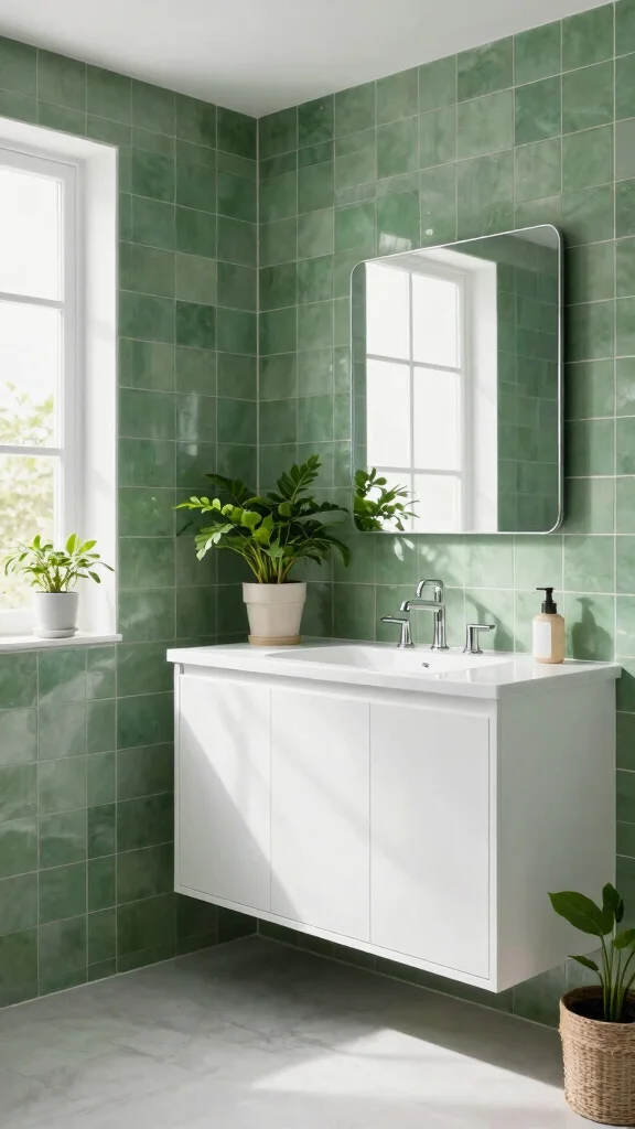 Consider placing green tiles on the floor or as a stylish backsplash, complemented by white elements for contrast. This arrangement will make your bathroom feel spacious and inviting. Mixing different shades of green, from deep forest to soft mint, adds depth to the overall look.
