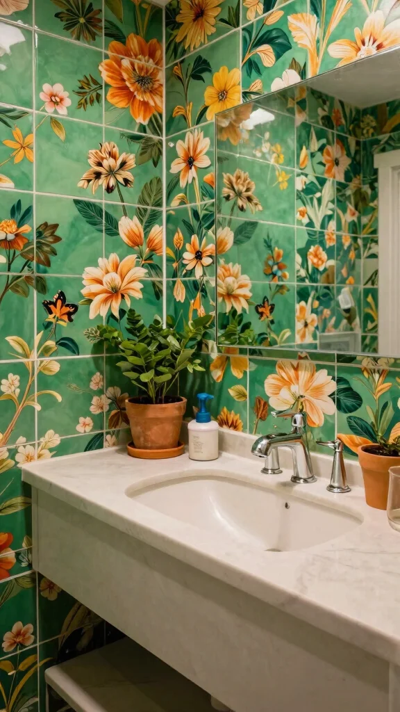 Bold floral patterns combined with green tiles create a playful and artistic bathroom space bursting with character.
