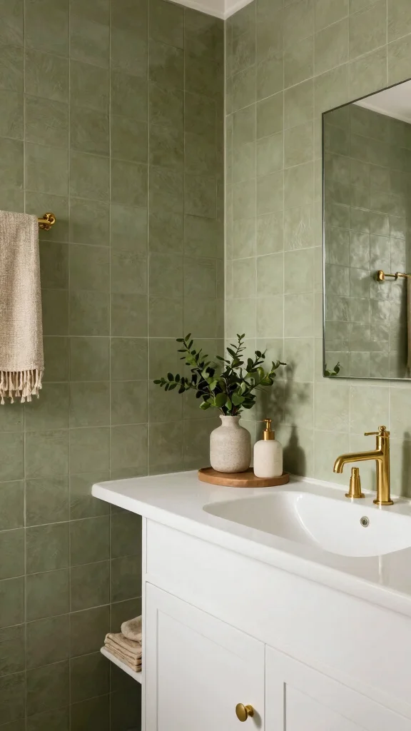 Pairing olive tiles with gold or brass fixtures introduces a glamorous touch while preserving a natural feel. Textured tiles can add depth, while accessories in natural fibers or soft neutral tones tie the entire look together beautifully.