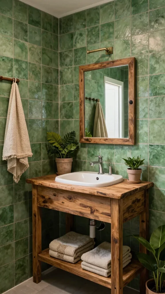 Rustic green charm perfectly encapsulates the essence of a cozy, eco-friendly bathroom that feels inviting and warm.