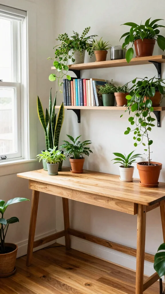 Integrating plants not only enhances the aesthetic but also invites soothing textures into your workspace, making it more inviting and inspiring.