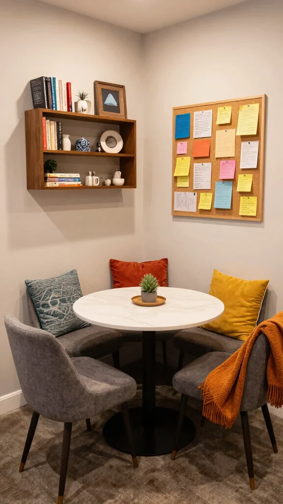 Transform an unused corner into a cozy nook that invites creativity and conversation. This charming workspace can be easily set up with a small table and two comfortable chairs, perfect for casual brainstorming or informal meetings. Adding a bulletin board keeps ideas and notes visible, creating an inspiring atmosphere.