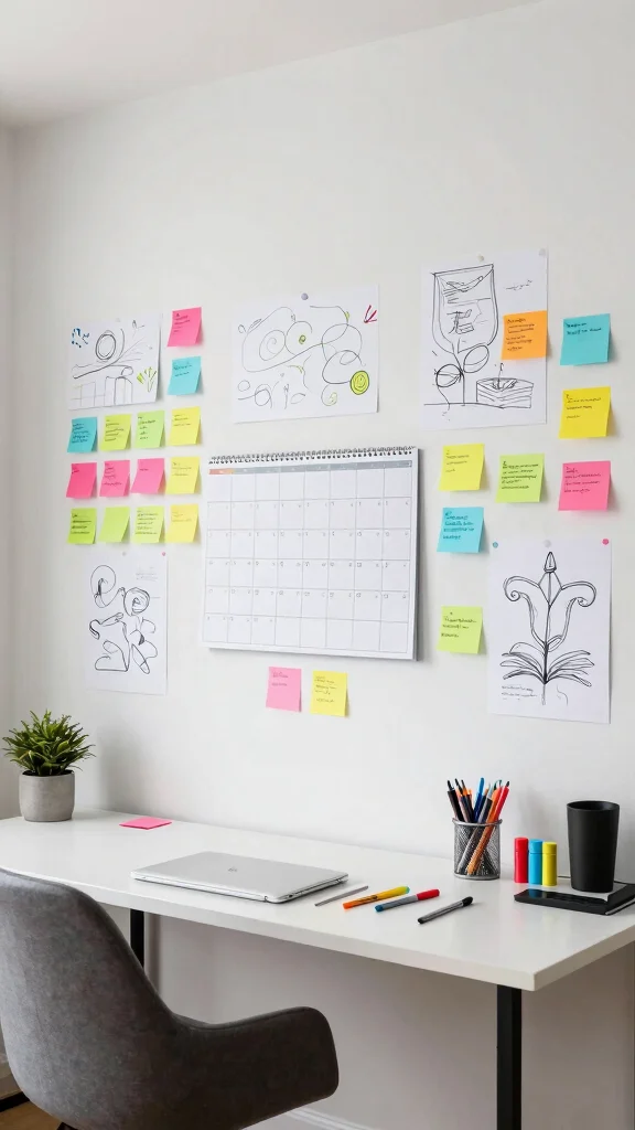 To make the most of your collaborative wall, use different colored markers or pins to categorize ideas, regularly updating the content to keep it fresh and engaging. Ensure that it’s easily accessible for both users, and consider creating sections for brainstorming and project tracking.
