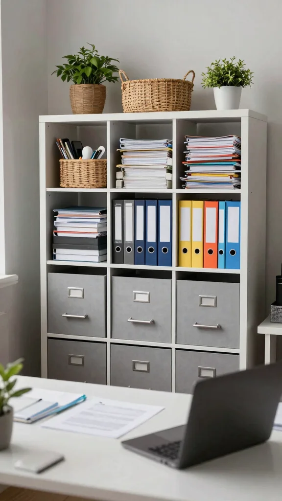 Consider using clear bins for visibility and labeling storage areas to avoid confusion. Vertical storage options can maximize space, while a designated filing cabinet helps keep important documents organized.