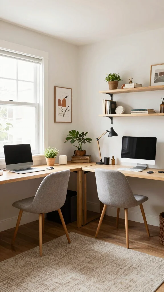 A dual desk setup can transform your workspace into a collaborative haven. This arrangement allows both individuals to have their own space while still feeling connected. By positioning two desks either facing each other or side by side, you create an environment that supports teamwork without sacrificing personal comfort. Pairing different desk styles can also reflect personal tastes, while a shared wall-mounted shelf keeps essentials organized and within reach.