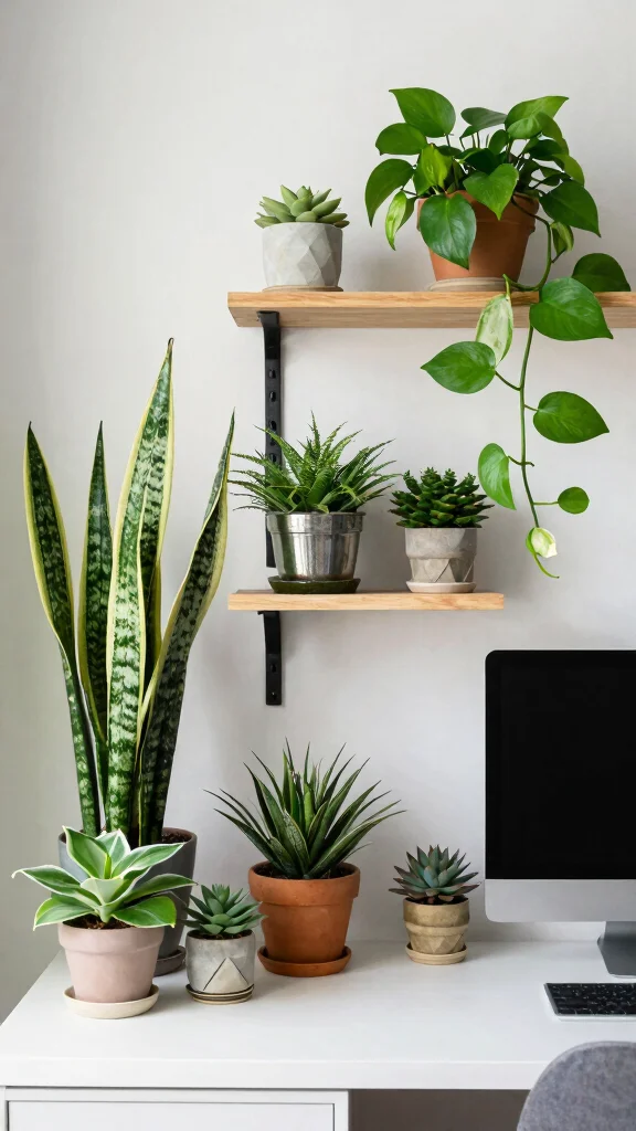 Plants like snake plants and succulents are perfect for small spaces, adding visual interest without overwhelming your setup. Incorporating greenery transforms your workspace into a calming retreat.