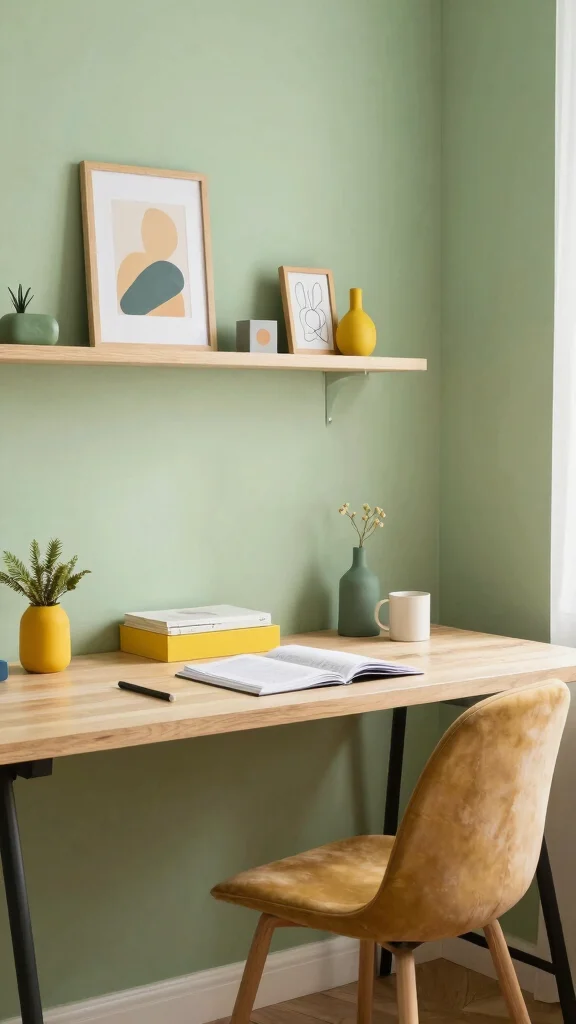 Soft greens create a refreshing atmosphere, while warm neutrals add coziness. Bright accents can energize the space, making it more stimulating for work.