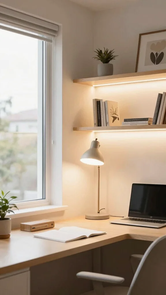 Use desk lamps with adjustable brightness for focused tasks, and position your desk near windows to maximize natural light. Layering different lighting sources creates an inviting atmosphere.