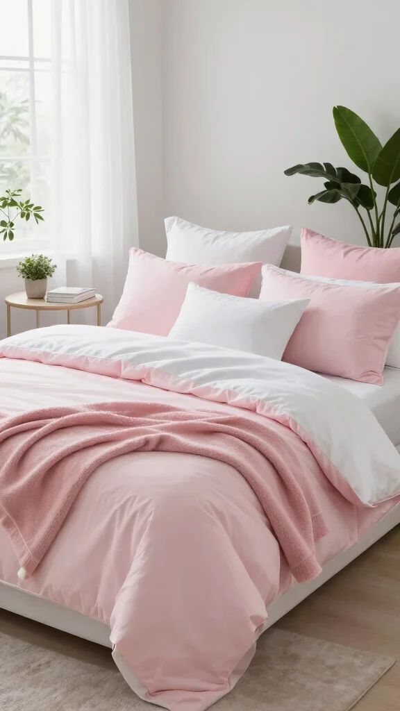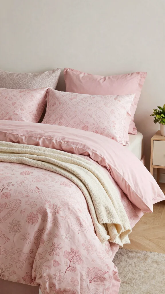 Fun fact: Rooms styled with crisp white and light pink bedding read up to 25% larger thanks to reflective light. Pair a light pink duvet with white pillowcases for an airy vibe, then add a soft throw to pull the look together.