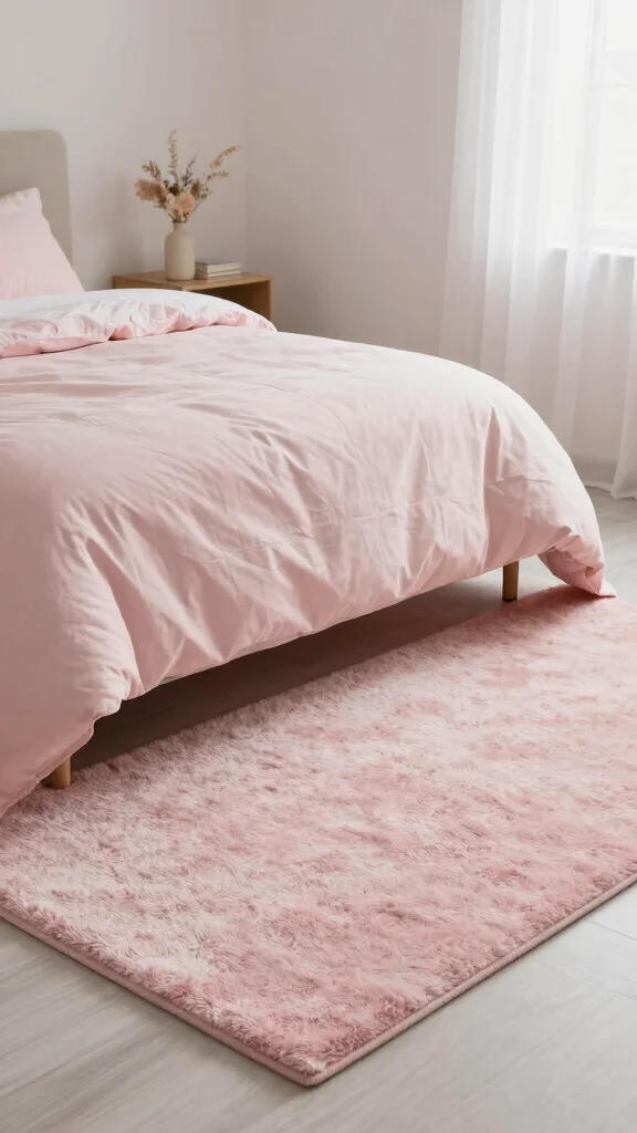 Rugs can tie a room together and add warmth, especially in minimalist spaces. A light pink textured rug serves as a beautiful grounding element beneath your bed. Look for plush options that feel good underfoot and provide an added layer of comfort to your overall design. Consider high-pile rugs for luxurious softness or flat weaves for practicality and easy cleaning. The right rug enhances the soothing aesthetic of your light pink bedding while ensuring your space feels cozy and complete.
