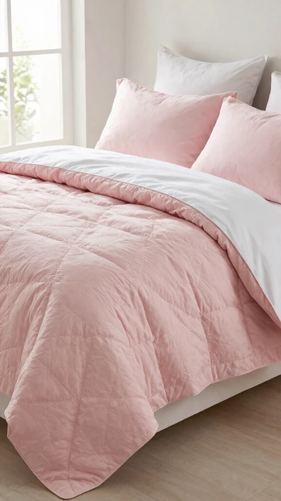 A blush pink quilt serves as a stunning top layer to your bedding setup, adding both style and comfort. Opt for a quilt with unique textures or patterns to elevate visual interest while keeping the ensemble soft and inviting. Quilts are ideal for spring and summer months, offering a lightweight alternative to heavier blankets. Pair your quilt with simple, neutral bedding beneath to highlight its elegance and charm. Consider a reversible quilt to easily switch up your look whenever you desire a change. This not only enhances the aesthetic but also adds layers of comfort to your bed.