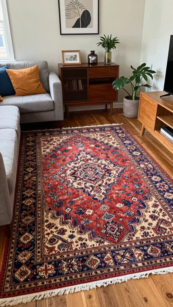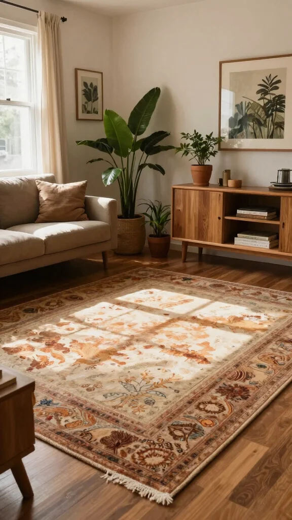Your rug should reflect the overall style of your living room. For a mid century modern look, opt for rugs with clean lines and minimalistic designs. Vintage-inspired Persian or kilim rugs can add character and warmth to a retro-themed space. Think about how the rug will fit into your living room’s design scheme. If you have a lot of contemporary furniture, a rug with retro appeal can create an exciting contrast.