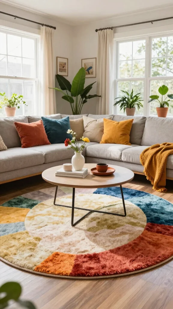 – Use round rugs under circular coffee tables for a cozy gathering space.
