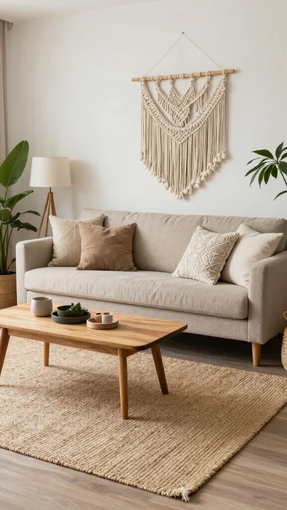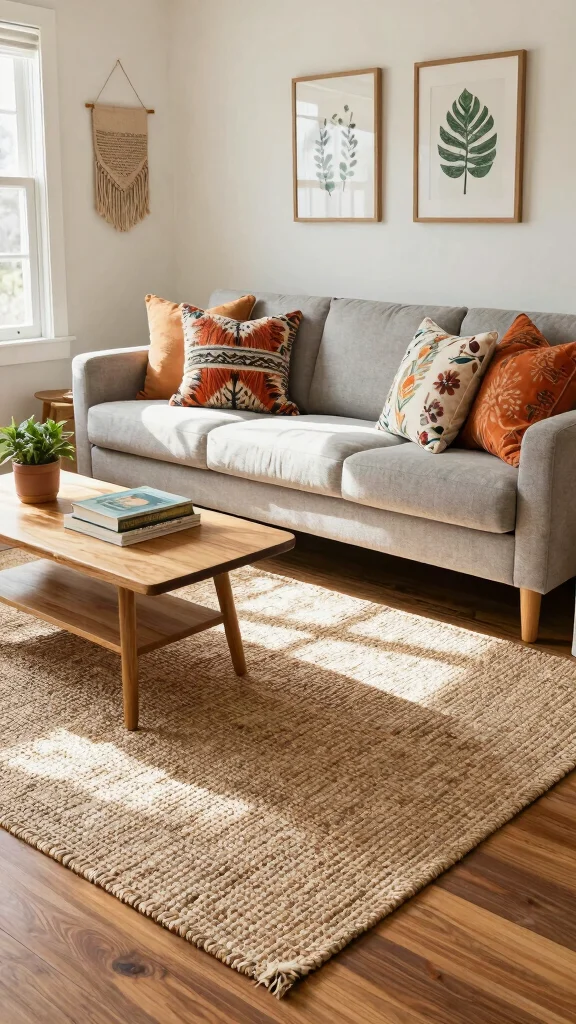 Natural fiber rugs enrich your living room with warmth and texture, creating a cozy atmosphere that aligns perfectly with your bohemian spirit.