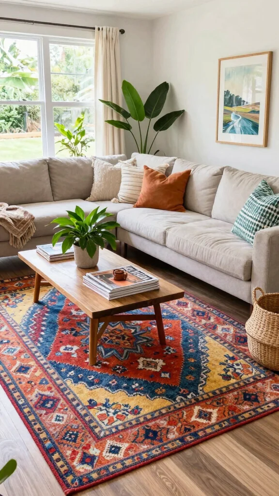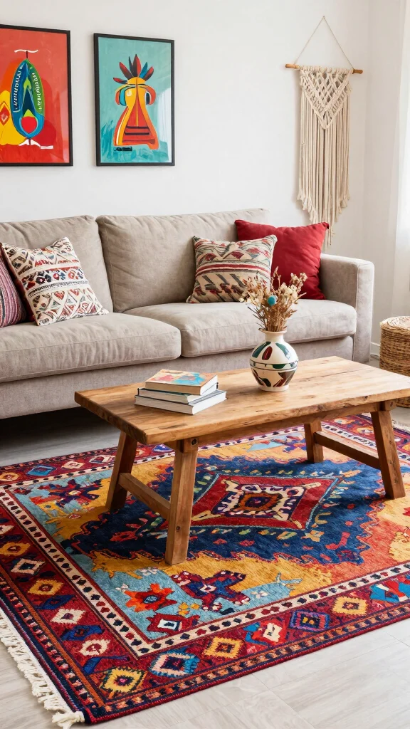 A handwoven rug can enhance your living room’s charm, adding warmth and personality that embodies the essence of your bohemian style.