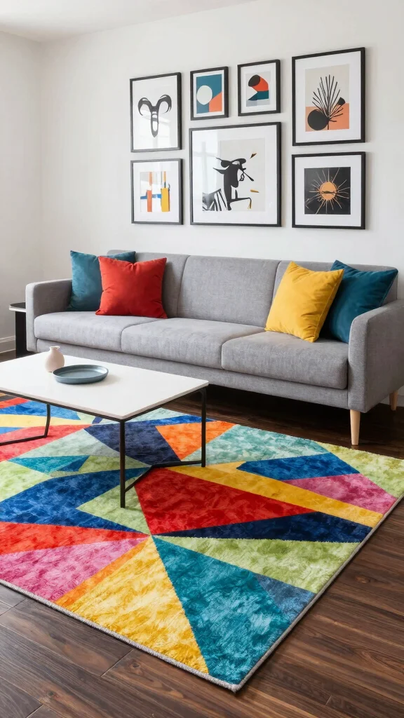 When selecting a geometric rug, consider how its colors will complement your existing palette. Look for budget-friendly options at local home goods stores or online marketplaces. This style aligns with design trends that favor dynamic shapes and patterns, creating a lively atmosphere in your space.