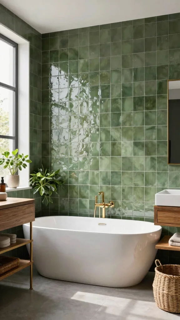 Incorporate olive green tiles for a rich, earthy foundation that elevates your bathroom’s aesthetic.