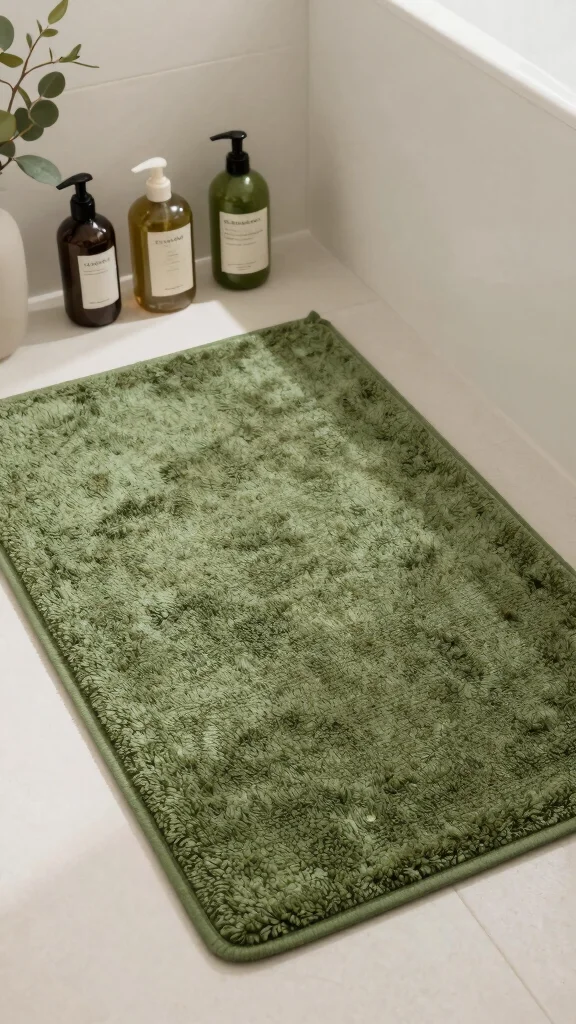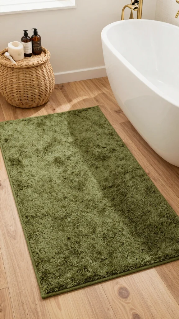 Incorporate various textures through rugs and bath mats to add depth and warmth to your olive green decor.