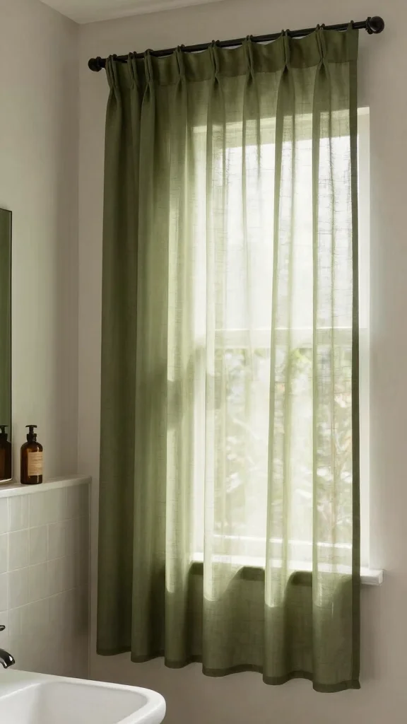 Window treatments can dramatically change the vibe of your bathroom, and incorporating olive green curtains or shades can add warmth and privacy. Soft fabrics in olive green enhance the overall ambiance while framing any views beautifully. Opt for sheer curtains that allow natural light to filter through or heavier shades for more coverage.