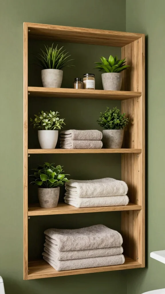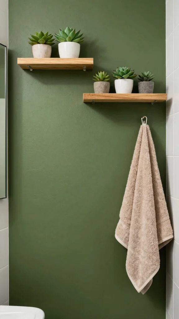 Open shelving combines functionality and aesthetic appeal in your olive green bathroom. It allows you to showcase beautiful towels, plants, or decorative items while keeping essentials accessible. Wooden shelves can enhance the natural style, framing your curated collection against the olive backdrop.