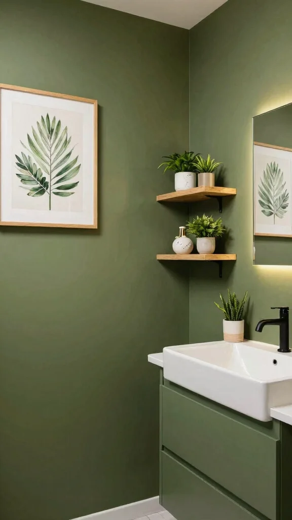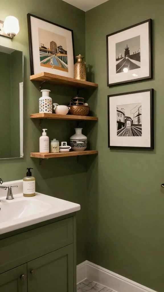 Incorporating art and decor can transform your olive green bathroom into a reflection of your personal style. Look for nature-inspired artwork or photography that complements the earthy tones of olive green. Wall-mounted decor, such as floating shelves for plants or decorative items, can add a personal touch while maintaining warmth in the space.