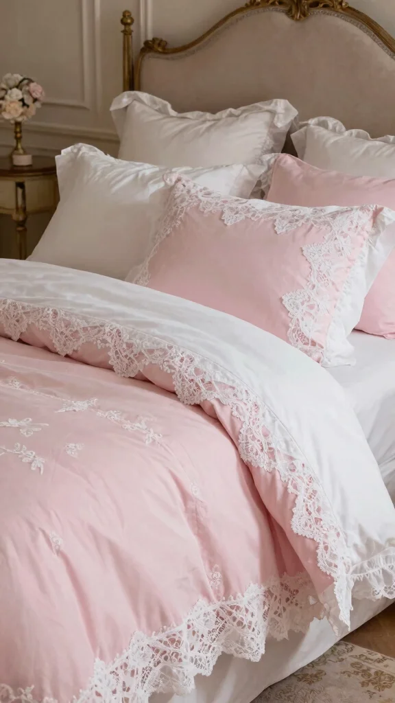 Pair lace with solid pink and white bedding to maintain sophistication. For a complete vintage vibe, consider including antique decor pieces, such as a vintage mirror or delicate lamp, that echo the lace theme.