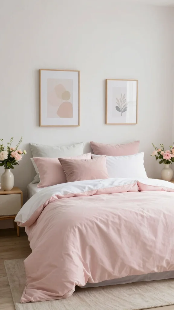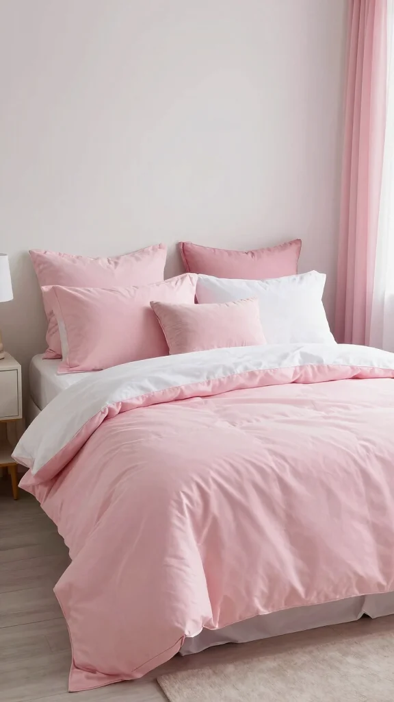 A soft pastel palette in pink and white bedding creates a dreamy, soothing atmosphere perfect for relaxation. Consider a light pink duvet paired with white sheets for a fresh, airy feel. Layer in pastel throw pillows and blankets for added comfort and warmth, helping you unwind after a long day.