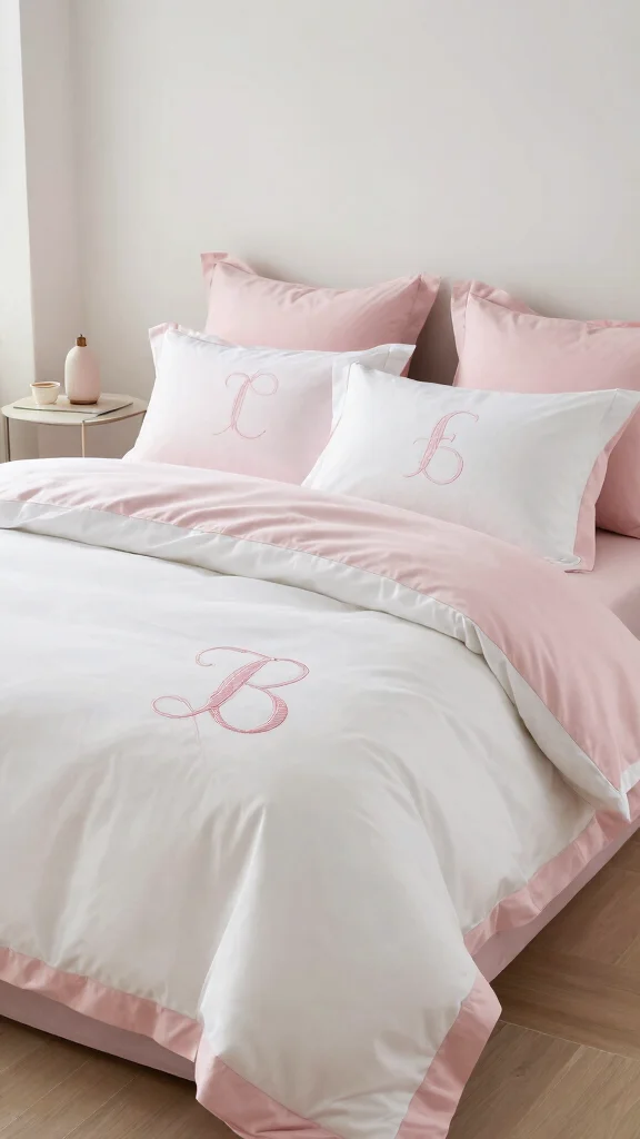 Personalization adds a unique touch to your pink and white bedding, with monograms being a chic way to achieve this. Consider a white duvet cover featuring your initials embroidered in soft pink for a stylish statement. This personal detail makes your space feel uniquely yours and adds an elegant layer to your decor.