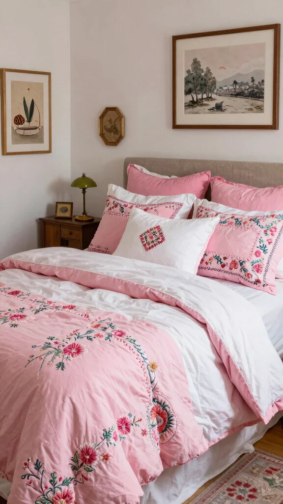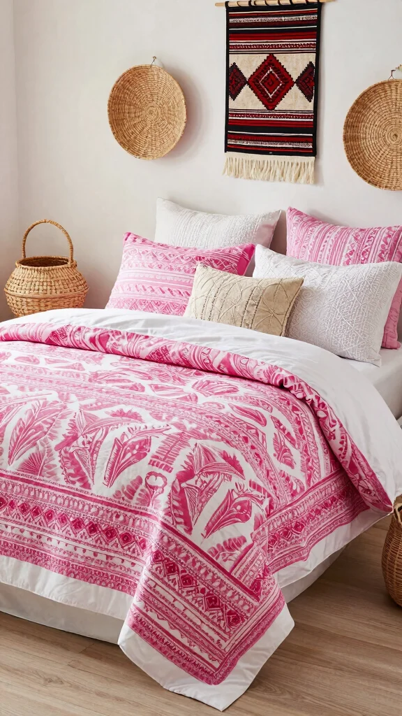Integrating ethnic prints and textiles into your pink and white bedding can create a rich, cultural feel in your bedroom. Look for duvet covers or throws that showcase intricate patterns, such as ikat or block prints, in shades of pink and white. These textiles add depth and character while honoring traditional craftsmanship.