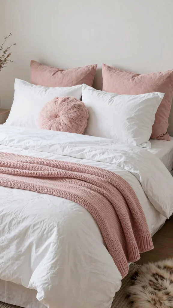 Fun fact: Adding 2-3 textured layers—plush white comforter, pink knitted throw, and velvet cushions—creates instant depth in pink and white bedding. Your bed feels cozier and more inviting at a glance.