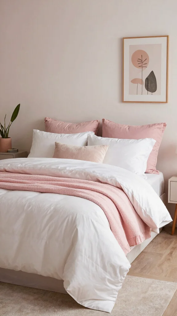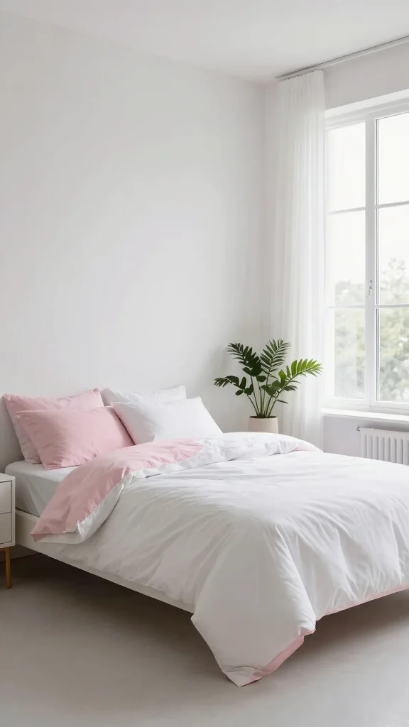 Fun fact: Minimalist pink and white bedding can make a small room feel up to 30% larger when paired with clean lines and light accents. Keep solid colors, add delicate pink piping, and let greenery do the rest.