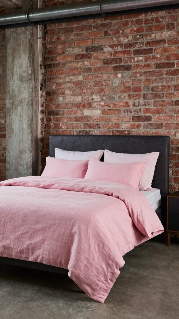 Create a strikingly modern bedroom by blending industrial elements with your pink linen bedding. Think exposed brick walls, metallic accents, and raw wood that contrast beautifully with the softness of pink. Your pink linens can soften the ruggedness of industrial features while making a bold statement.