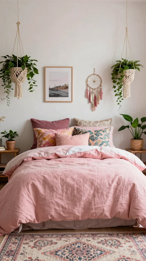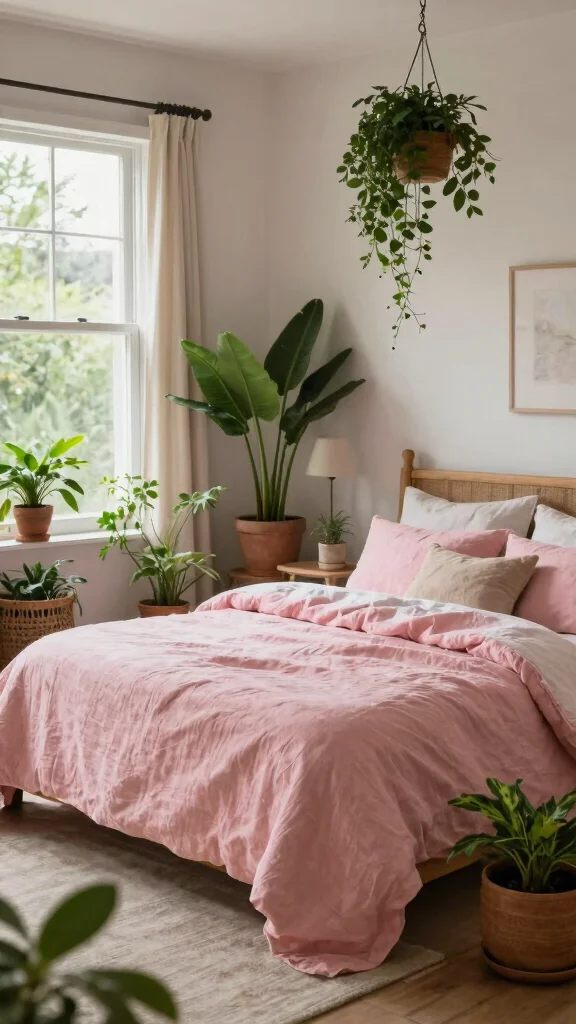 Infuse your bedroom with a whimsical, bohemian spirit by complementing your pink linen bedding with eclectic accents. Think macramé wall hangings, patterned rugs, and unique decor items that echo a natural, earthy feel. This style thrives on richness in texture and layering, making it a fantastic match for the softness of pink linen.