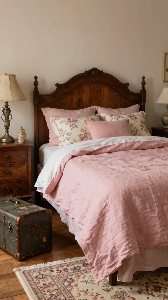 Embrace vintage charm in your bedroom with pink linen bedding as a beautiful canvas. Incorporate rustic wooden headboards or vintage trunks at the foot of your bed to create a timeless feel. Pair your pink linens with floral-patterned throw pillows or delicate lace accents to amplify the nostalgic vibe.