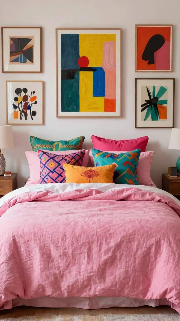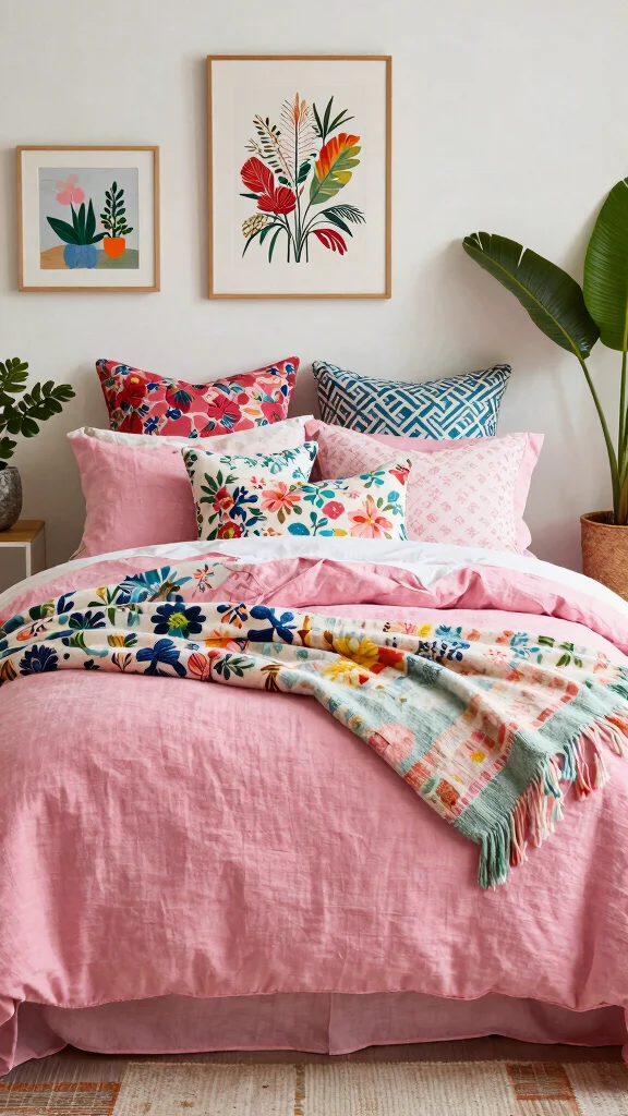 Transform your bedroom into a creative haven with pink linen bedding as the perfect backdrop for artistic expression. Layer your bedding with vibrant, artistic pillows and throws to showcase your unique personality. Bold artwork on the walls can complement the pink and introduce pops of color to the space.