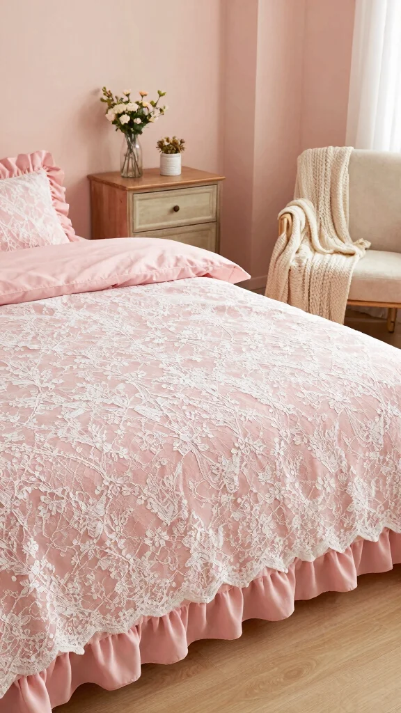 I found that layering a lace overlay over pink ruffle bedding instantly turns a simple bedroom into a romantic sanctuary. It’s easy, affordable, and totally transforms the vibe—perfect for embracing feminine, shabby chic charm every night.