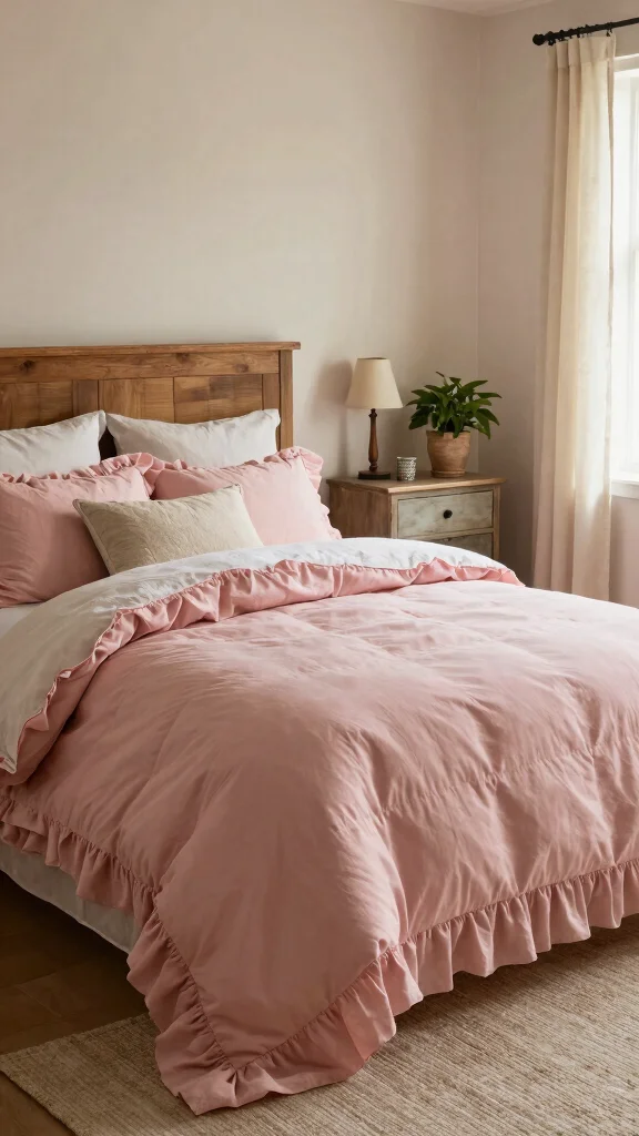 Embrace the charm of farmhouse decor with pink ruffle bedding that embodies rustic elegance. This style focuses on simplicity, warmth, and a touch of nostalgia, working beautifully in both modern and traditional settings to create a welcoming atmosphere.