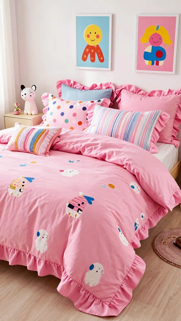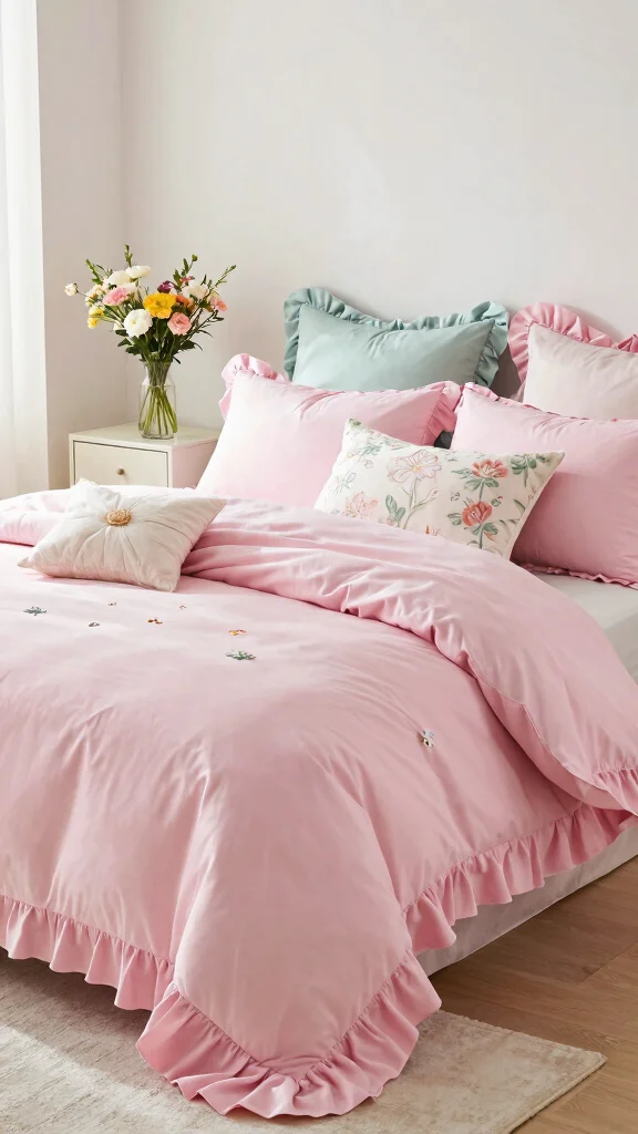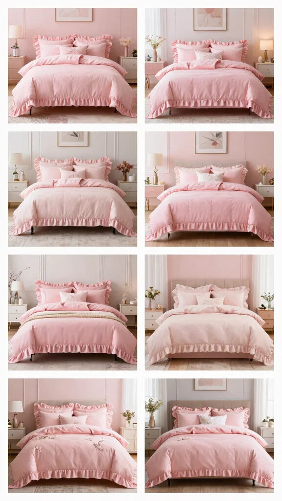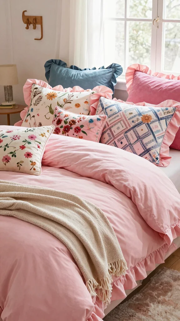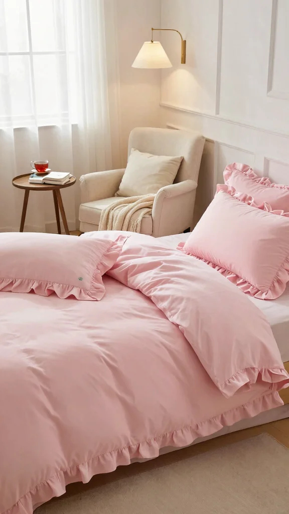 Elevate your pink ruffle bedding with bold statement pillows that pop. Unique patterns, textures, or oversized shapes can introduce character to your bed, making it a focal point in your bedroom. This approach allows you to play with color and style effortlessly.